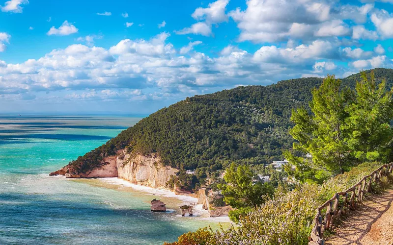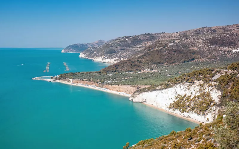Das Vorgebirge des Gargano befindet sich in Apulien und gilt aufgrund seiner Form als der „Stiefelsporn Italiens“. Dieses Vorgebirge, das sich in die Adria erstreckt, besteht fast vollständig aus einer Bergmasse aus Karstfelsen. Üppige Vegetation, kristallklares Meer, malerische Ortschaften, Orte des Glaubens und unverfälschte Aromen sind die charakteristischen Elemente des Gargano. Ein Juwel der Natur, das mit der Einrichtung des Nationalparks unter Schutz gestellt wurde. Zu diesem gehört auch der umbrische Wald, das Meeresschutzgebiet der Tremiti-Inseln sowie die Küstenseen Lesina und Varano.