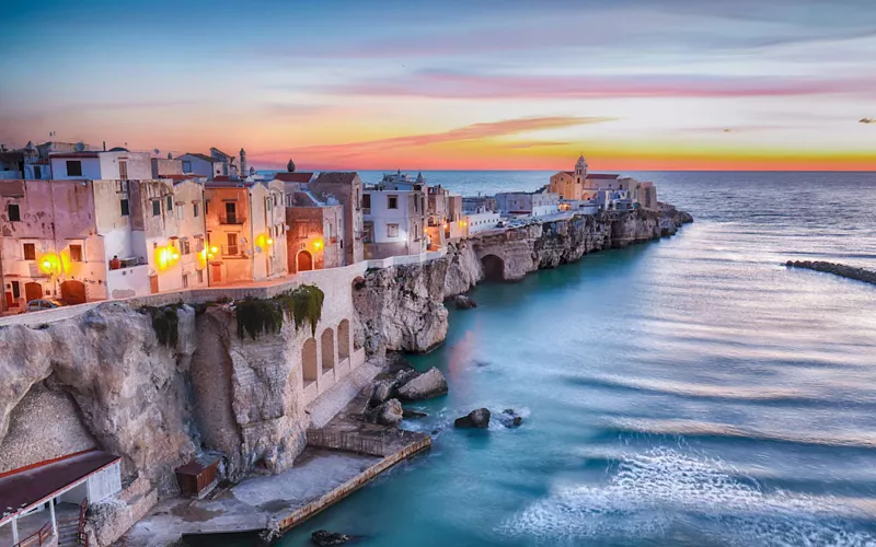 An der östlichen Spitze des „Sporns“ befindet sich Vieste, das wichtigste Touristenzentrum des Gargano: ein beeindruckendes Meer zwischen zwei langen weißen Sandstränden und darüber, auf einem felsigen Vorgebirge, ein Dorf mit Treppen und verwinkelten Gassen, weißen Häusern und Bogengängen. Als langjähriger Bischofssitz (von 918 bis 1817) lohnt sich in dieser bezaubernden Stadt ein Besuch der romanisch-apulischen Kathedrale, des Schlosses (beide Gebäude wurden von Friedrich II. restauriert) und des Monolithen „Pizzomunno“. Der etwa 25 Meter hohe Monolith befindet sich am Anfang des Strandes, der auch „del Castello“ genannt wird, und gilt als Symbol von Vieste.