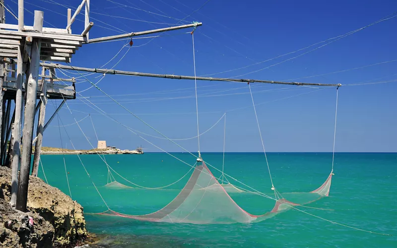 Entlang der Küste können Sie einige Trabucchi bewundern. Dabei handelt es sich um alte Angelanlagen, die mit langen Holzarmen ausgestattet sind, die ein Netz stützen. Wenn wir unsere Reise fortsetzen, durchqueren wir Manacore mit einer der eindrucksvollsten Buchten in Apulien und erreichen Peschici, ein Dorf, das sich auf einer hohen Klippe mit Blick auf das blaue Meer befindet, innerhalb der alten Mauern mit den charakteristischen Kuppelhäusern. Eine Besonderheit der Gegend sind die Trabucchi und die Überreste mehrerer Küstentürme, die in der zweiten Hälfte des 16. Jahrhunderts zur Verteidigung des Gebiets gegen Piraten und Korsaren errichtet wurden.