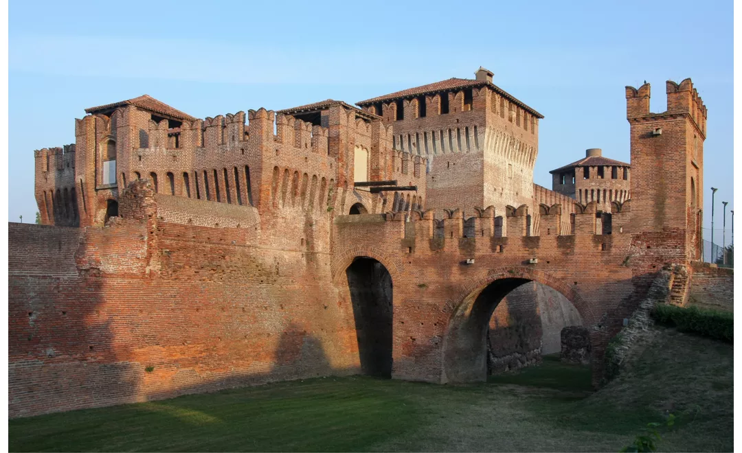 Die Rocca Sforzesca in Soncino, in der Provinz Cremona, erzählt von der Umwandlung von einem Militärgebäude aus dem 10. Jahrhundert in eine Adelsresidenz. Die Türme, der Graben, die Zinnen und die Zugangsbrücke enthüllen die Aufgabe der Verteidigung. Im Inneren können Sie die Spuren der Fresken sehen, die von der Mailänder Familie Stampa in Auftrag gegeben wurden.