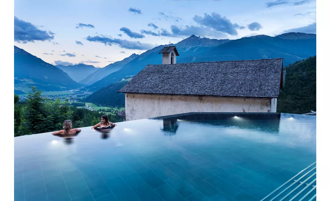 Die erste bietet einen atemberaubenden Panoramapool mit Blick auf das Tal von Bormio, während die zweite über Becken und Außenpools in einem großen Garten verfügt.