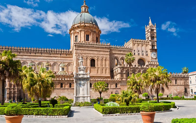 Treffen am Morgen vor dem Palazzo dei Normani, heute Sitz des Regionalparlaments. Das Gebäude, das zum UNESCO-Weltkulturerbe gehört, ist die älteste königliche Residenz in Europa, Aufenthaltsort der Herrscher des Königreichs Sizilien und kaiserlicher Sitz von Friedrich II. und Konrad IV. Allgemein bekannt ist er als Palazzo Reale oder Königspalast. Im ersten Stock befindet sich die Cappella Palatina, ein UNESCO-Weltkulturerbe, das im Rahmen der arabisch-normannischen Route von Palermo, Cefalù und Monreale, besichtigt werden kann und in der die Einflüsse von Religionen und Kulturen des Mittelmeers über die Jahrhunderte hinweg zu erkennen sind, in ihrer Architektur verbindet sich der Grundriss der lateinischen Basilika mit Dekorationen aus der islamischen Architektur, wie zypressenförmigen Stalaktiten, die Muqarnas genannt werden: ihr Herz bleibt jedoch byzantinisch: Die halbkugelförmige Kuppel beherbergt ein atemberaubendes Mosaik des „Christus Pantokrator“.