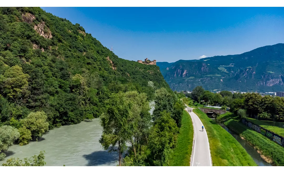 Der zweite Teil des 43 km langen Radwegs verläuft leicht entlang des gewundenen Talbodens. Bevor Sie die Hauptstadt erreichen, lohnt sich ein Besuch in Klausen, der Künstlerstadt, die vom imposanten Kloster Sabiona dominiert wird. Von Brücke zu Brücke entlang der Ufer des Eisack erreichen Sie Bozen, ein Wunder in Form einer Stadt, die von den Dolomiten umarmt wird, modern, ruhig und tief mit den alten Traditionen verbunden. Nach dem Besuch des Museion und vieler anderer Sehenswürdigkeiten endet Ihre Reise in Schloss Runkelstein, das etwas weiter nördlich über dem Fluss Talfer liegt. In Bozen haben Sie die Möglichkeit, den Etsch-Radweg fortzusetzen und so die beiden Seelen dieser faszinierenden Region, Trentino-Südtirol, zu durchqueren.