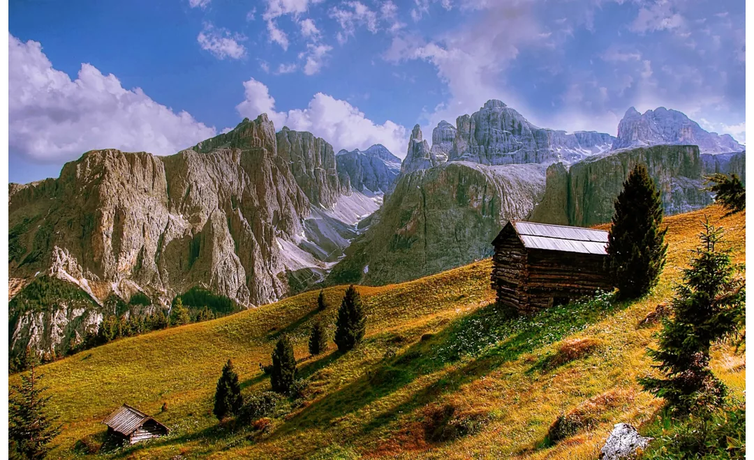 Berge, die Farben und Formen hervorheben und Harmonie mit allem erzeugen, was sie umgibt. Eine Bergkette, die als Weltkulturerbe anerkannt ist und eine der berühmtesten Landschaften Italiens und Europas darstellt, die die Vorstellungskraft all derer tief prägt, die sie bewundert oder erlebt haben. Die Größe dieser Steinriesen hat ihre Wurzeln in der prähistorischen Zeit, genauer gesagt in der Trias, als vor etwa 250 Millionen Jahren die Ansammlung von Muscheln, Korallen und Algen Sedimente hervorbrachte, die sich dann in Felsen verwandelten, und der anschließende Zusammenstoß zwischen der europäischen und der afrikanischen Platte die Felsen auf eine Höhe von mehr als 3.000 Metern über dem Meeresspiegel hob. Eine ungewöhnliche Vielfalt an Formen definiert den Charakter dieser besonderen Landschaft, in außergewöhnlichem Kontrast zu den weichen Linien der Wiesen zu ihren Füßen, und zeichnet ihre vertikalen Grenzen aus: Schaufeln, Türmen, Glockentürmen, Zinnen, Felsnadeln, Zähnen – und horizontal: mit Rinnen, Dächern, Gesimsen, Terrassen und Hochebenen. Die ersten Bilder dieser Berge wurden nicht gemalt oder porträtiert, sondern sind Beschreibungen, Worte, die die größten Gruppen erzählten: Marmolada, Sella-Gruppe, Langkofel-Gruppe, Rosengarten, Latemar, Pale di San Martino mit außergewöhnlichen Aussichten und starken Emotionen.