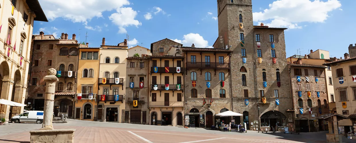 When walking around Arezzo, we recommend visiting the Gothic-style Cathedral, with its stunning stained-glass windows by Marcillat and the restored fresco of Mary Magdalene by Piero della Francesca. Also worth visiting are the splendid Pieve di S. Maria Romanesque parish church, Piazza Grande with the Logge Vasari, the Palazzo della Fraternita dei Laici with its façade by Bernardo Rossellino, the picturesque medieval tower-houses, and the church of S. Domenico with the Crucifix painted by Cimabue. Not forgetting the Palazzo del Comune, Casa Petrarca and Palazzo Pretorio.