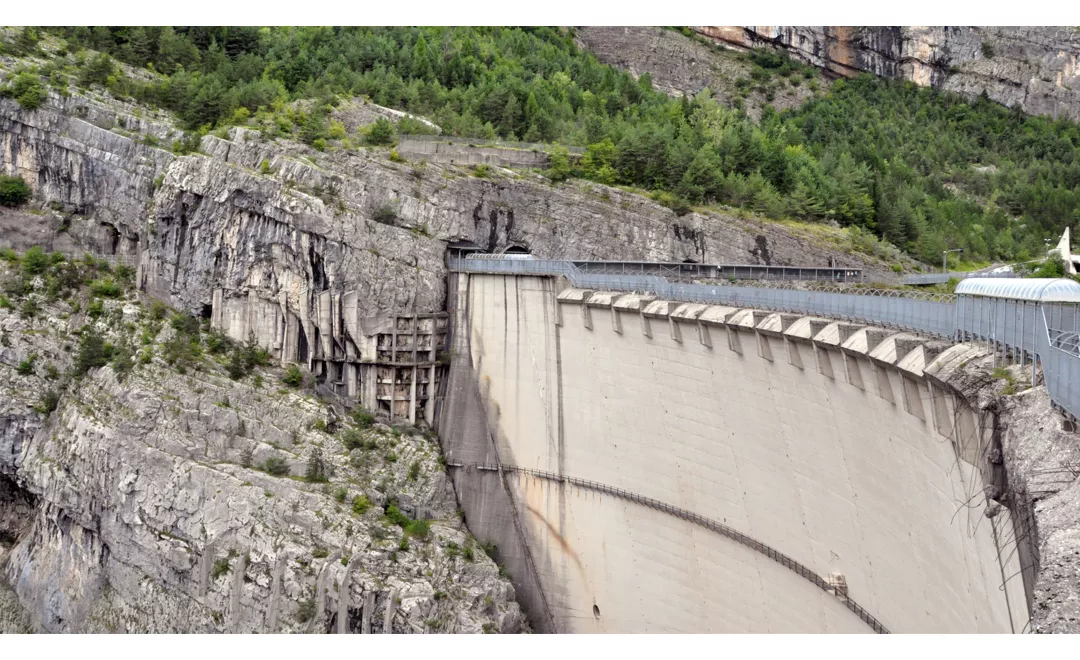 La presa, de 261 m de altura y 190 m de longitud, se convierte en un coloso artificial en el valle: una instalación de poder, un símbolo de la confianza del hombre en su capacidad para dominar la naturaleza.