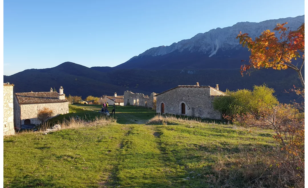 Plus loin, entre les villages de Rocca di Mezzo et Fontecchio, le chemin de S. Tommaso effectue un autre détour exigeant, avec une pente de 20 %. Ne vous découragez pas, car à la fin de la montée, vous trouverez l'un des joyaux cachés de l'arrière-pays des Abruzzes : les Pagliare di Tione. Les « pagliare » étaient les maisons en pierre où les paysans se déplaçaient autrefois de façon saisonnière pour travailler les champs sur le plateau. Les Pagliare di Tione ont été rénovées ces dernières années et forment aujourd'hui un village pittoresque au pied du mont Sirente.