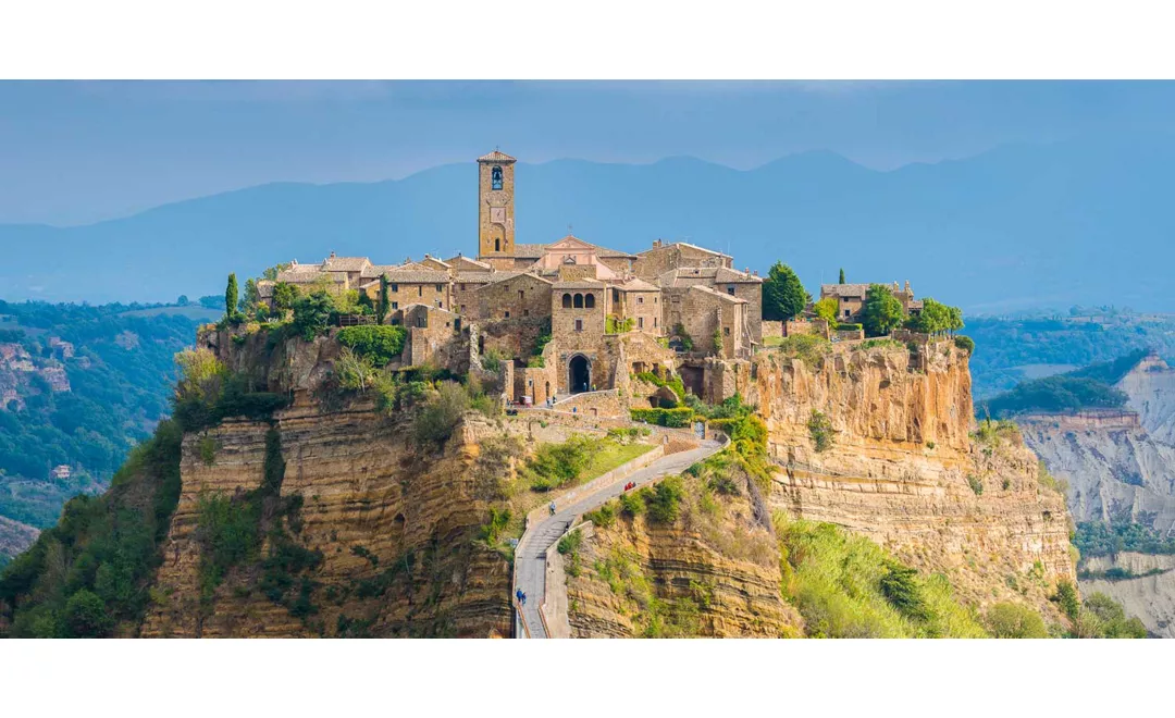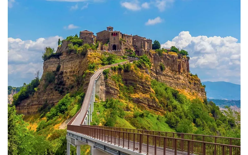 Lorsqu'elle apparaît à l'horizon, Civita di Bagnoregio ressemble presque à un mirage. Ce petit village pittoresque est perché sur une colline de tuf accessible uniquement grâce à un long pont piétonnier. En franchissant la porte d'entrée, on a l'impression que le temps s'est arrêté. De la place centrale part un dédale de ruelles, chacune débouchant sur des balcons et des terrasses qui s'ouvrent sur le magnifique panorama de la Vallée des Calanques, un paysage en constante évolution, où le sol calcaire et l'argile sableuse sont façonnés par les agents atmosphériques. Civita di Bagnoregio, qui fait partie des plus beaux villages d'Italie, est une destination incontournable pour ceux qui recherchent des ambiances paisibles et une touche de poésie.