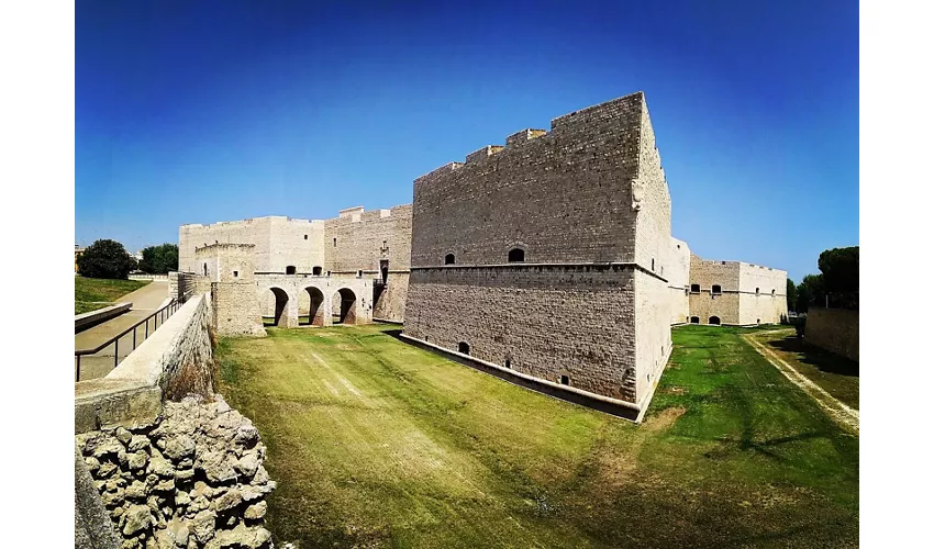 È guardando il castello di Barletta che si può ripercorrere in un solo istante la storia della città, dal Medioevo all’età moderna. Federico II di Svevia lo fece costruire su fortificazioni normanne adattandole a una pianta quadrangolare, efficiente e razionale, e ricavò al suo interno spazi residenziali degni di una corte imperiale, così da potervi soggiornare a lungo. Poi il castello fu rafforzato a fine ’200 da Pierre d’Angicourt, grande architetto agli ordini della famiglia d’Angiò, nel secondo ’400 dai nuovi signori aragonesi e alla metà del ’500 dagli ingegneri spagnoli al servizio di Carlo V d’Asburgo, che aggiunsero i bastioni angolari e scavarono i fossati. Il risultato fu quello che in gran parte ammiriamo ancora oggi: una solida struttura quadrangolare, con spigoli difesi da bastioni pentagonali e un fossato che girava su tre lati, mentre il lato settentrionale all’epoca dava direttamente sulla costa. Oggi il castello accoglie il Museo civico di Barletta.