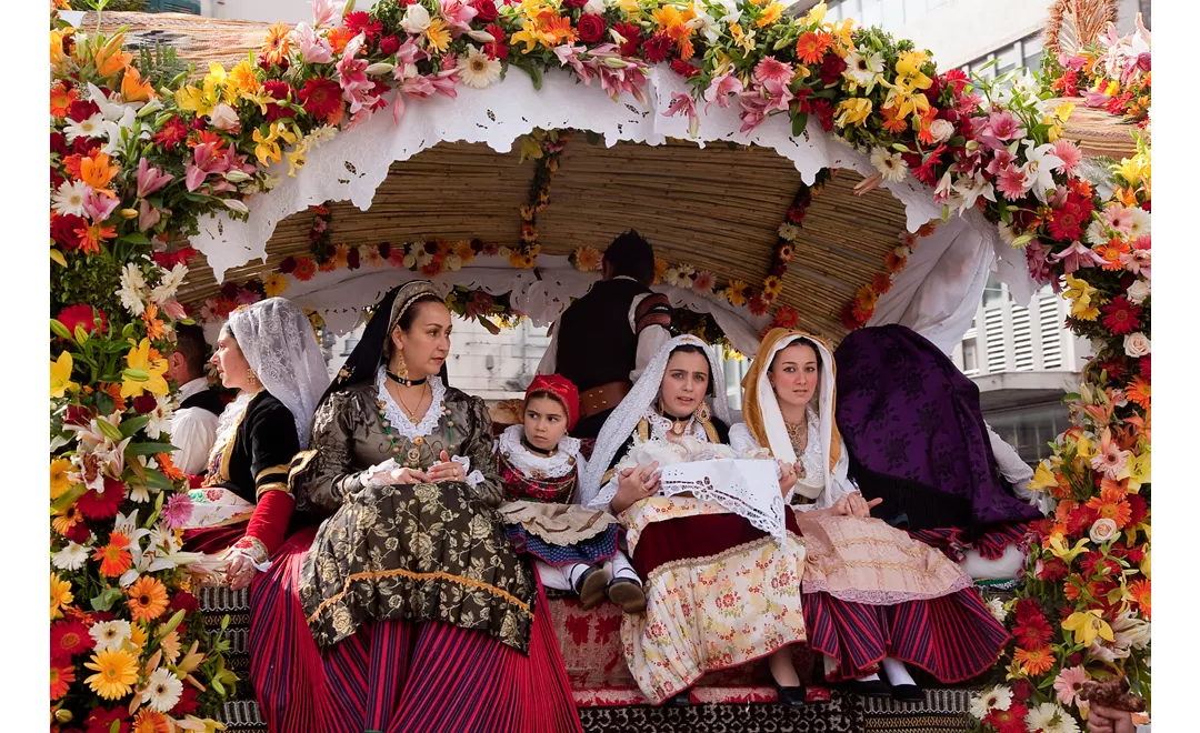 Gli abiti tradizionali della Sardegna variano da paese a paese, raccontando storie e caratteri differenti. A Desulo, le donne indossano vivaci cuffie decorate a mano, ricamate con dettagli in miniatura che riproducono i motivi geometrici gialli, rossi e blu dell’abito tradizionale. A Tempio Pausania domina invece l’eleganza austera dell’abito in seta damascata nera, impreziosito da pizzi bianchi trattenuti dalla filigrana.