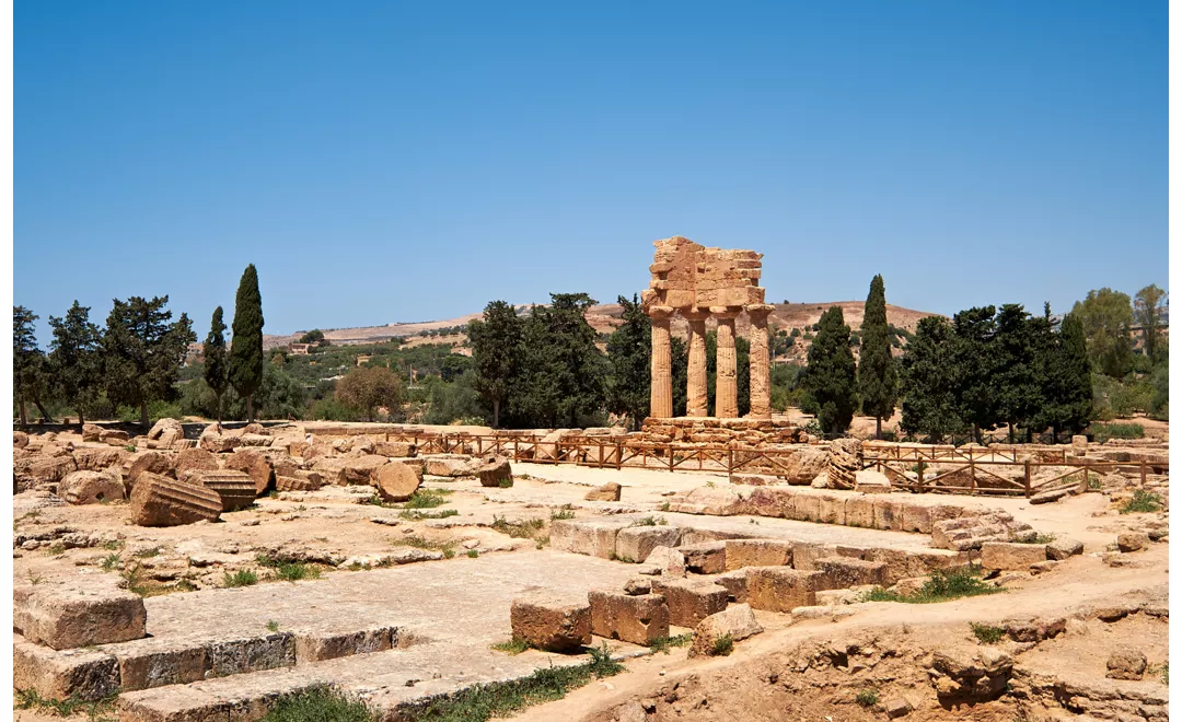 De manhã cedo ou ao pôr do sol, para evitar caminhar sob um sol ofuscante e abrasador, pode-se deslocar entre o templo dedicado a Hera Lacinia, que os romanos rebatizaram de Juno, situado no topo panorâmico da colina, e o da Concórdia, que faz lembrar o Partenon de Atenas e se destaca como uma das obras mais perfeitas e mais bem preservadas da arquitetura dórica. Depois, encontra-se o templo de Júpiter Olímpico, sem colunas elevadas, mas com estátuas deitadas no chão que parecem estar a dormir. Além disso, o santuário de Deméter e Coré (século VI-V a.C.) e o templo de Castor e Pólux, os Dióscuros: as quatro colunas sobreviventes tornaram-se o símbolo de Agrigento. Por fim, o Jardim de Kolymbetra, com os seus cinco hectares de vegetação deliciosa entre paredes de calcário.