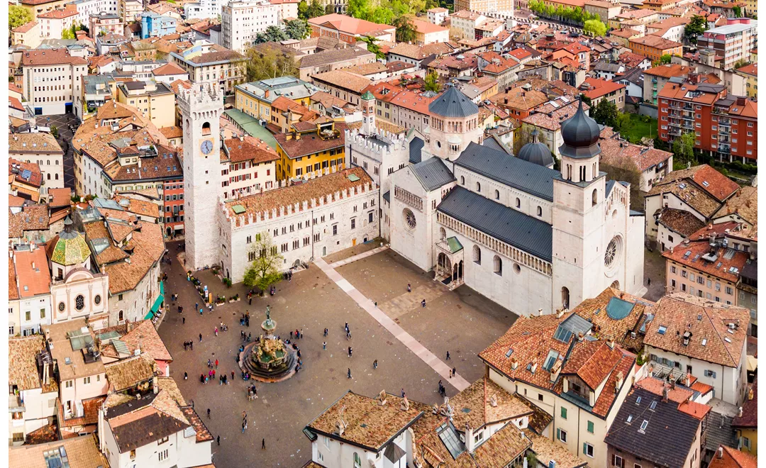 A Praça da Catedral é um concentrado dos mais belos edifícios históricos da cidade. Muito elegante, com a imponente Catedral de São Vigílio, animada e colorida, graças às fachadas das casas pintadas que repousam sobre arcadas baixas sob as quais as mesas de café estão distribuídas. Uma conversa sentados a uma mesa na praça é a conclusão digna do passeio pelo Sas. Enquanto saboreia um café ou desfruta de um aperitivo, pode admirar o Palazzo Pretorio com ameias, dominado pela torre cívica, ou desfrutar da vista, no lado oposto da catedral, das casas Cazuffi Rella, com os seus telhados salientes, de origem gótica, renovadas no século XV e redecoradas com frescos em 1531-33. No centro da praça, a fonte de Neptuno, uma obra barroca em pedra vermelha de Trento projetada por Francesco Antonio Giongo da Lavarone, domina a cena. Na esquina com a Via Cavour, por outro lado, encontra-se a Casa Gerloni, em cuja fachada uma placa de mármore lembra que, em 4 de fevereiro de 1875, no segundo andar da casa, nasceu o patriota Cesare Battisti. A partir da Piazza del Duomo, pode depois ir para sul e entrar no Borgo Nuovo, em torno das ruas S. Vigilio e Mazzini, a mais recente das aldeias em que a cidade foi dividida, que preserva um belo tecido de construção de casas antigas, locais e lojas. Pode depois chegar à Piazza de Fiera, onde, da última semana de novembro à primeira semana de janeiro, pode visitar os históricos mercados de Natal.